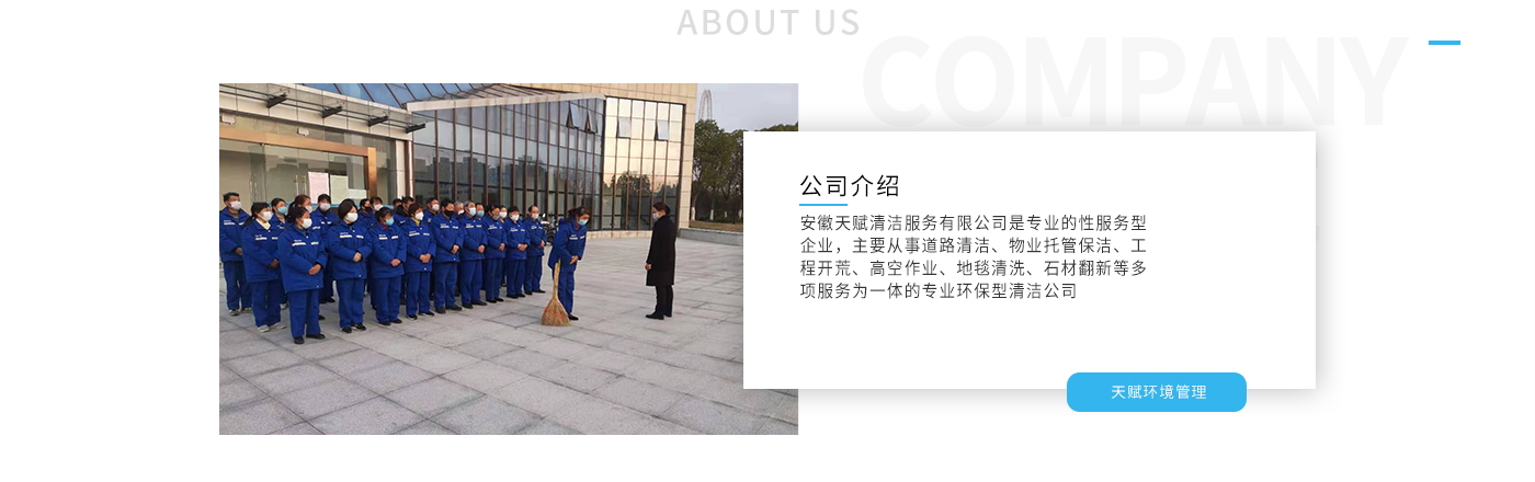 安徽天賦清潔服務(wù)有限公司是的服務(wù)型企業(yè),主要從事道路清潔、物業(yè)托管保潔、工程開荒、高空作業(yè)、地毯清洗、石材翻新等多項服務(wù)為一體的環(huán)保型清潔公司。公司管理機制完善,清潔作業(yè)經(jīng)驗豐富,擁有技術(shù)力量,嚴格實行崗前培訓(xùn)—崗中督查—上崗在培訓(xùn)的員工管理措施,憑著優(yōu)良的清潔質(zhì)量和嚴格的督查管理,為眾多企事業(yè)單位、醫(yī)院、酒店、廠區(qū)商場、物業(yè)、道路、學校、公園等提供后勤清潔服務(wù)。在業(yè)內(nèi)擁有良好的口碑。工作人員,服務(wù)態(tài)度優(yōu),竭力為客戶提供好的保潔服務(wù)。安徽天賦清潔服務(wù)有限公司:致力于長期合作關(guān)系,提高服務(wù)質(zhì)量,提供高標準的清潔服務(wù)。公司的經(jīng)營理念:為營造一個更清潔、亮麗的生活和工作環(huán)境而努力!“誠信”是公司成功保證。“客戶至上,信譽為首”是公司宗旨。高標準提供服務(wù),維護客戶利益、形象,是我始終不渝的目標。