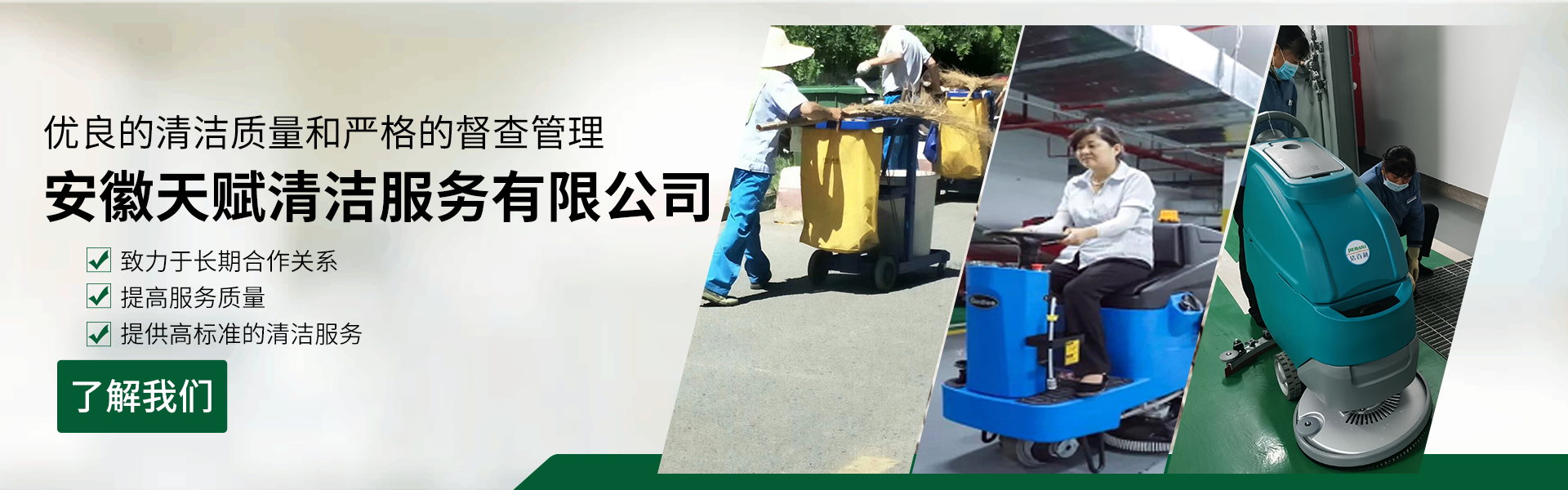 安徽天賦清潔服務(wù)有限公司是的服務(wù)型企業(yè),主要從事道路清潔、物業(yè)托管保潔、工程開荒、高空作業(yè)、地毯清洗、石材翻新等多項服務(wù)為一體的環(huán)保型清潔公司。公司管理機制完善,清潔作業(yè)經(jīng)驗豐富,擁有技術(shù)力量,嚴格實行崗前培訓(xùn)—崗中督查—上崗在培訓(xùn)的員工管理措施,憑著優(yōu)良的清潔質(zhì)量和嚴格的督查管理,為眾多企事業(yè)單位、醫(yī)院、酒店、廠區(qū)商場、物業(yè)、道路、學校、公園等提供后勤清潔服務(wù)。在業(yè)內(nèi)擁有良好的口碑。工作人員,服務(wù)態(tài)度優(yōu),竭力為客戶提供好的保潔服務(wù)。安徽天賦清潔服務(wù)有限公司:致力于長期合作關(guān)系,提高服務(wù)質(zhì)量,提供高標準的清潔服務(wù)。公司的經(jīng)營理念:為營造一個更清潔、亮麗的生活和工作環(huán)境而努力!“誠信”是公司成功保證。“客戶至上,信譽為首”是公司宗旨。高標準提供服務(wù),維護客戶利益、形象,是我始終不渝的目標。